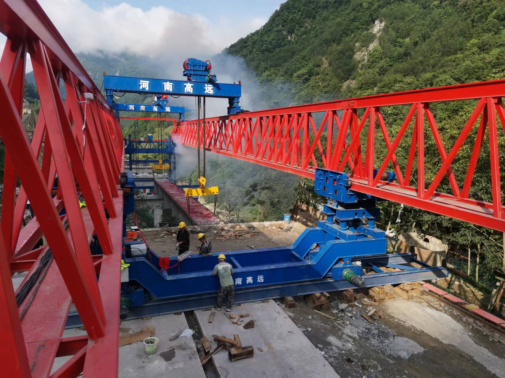 架橋機(jī)主要由主梁、懸臂梁、下導(dǎo)梁、前后支腿、輔支腿、吊梁行車、懸臂吊及電液系統(tǒng)組成。適用于三種不同跨徑單跨簡支梁的架設(shè),作業(yè)效率高。本類型架橋機(jī)能夠架設(shè)直線、曲線、縱坡的等跨及變跨雙線預(yù)應(yīng)力混凝土整孔箱梁。該 架橋機(jī)除了能夠進(jìn)行標(biāo)準(zhǔn)架設(shè)作業(yè)外,還能滿足首末跨架設(shè)、曲線架設(shè)、變跨架設(shè)、跨連續(xù)梁、結(jié)合梁、連續(xù)鋼構(gòu)等。既有橋梁架設(shè)、簡支變跨連續(xù)架設(shè)等工況施工。具有簡支架設(shè)、定點(diǎn)起吊、梁體吊裝穩(wěn)定性好、作業(yè)效率高、安全可靠、變跨調(diào)整方便、操作方便等特點(diǎn)。